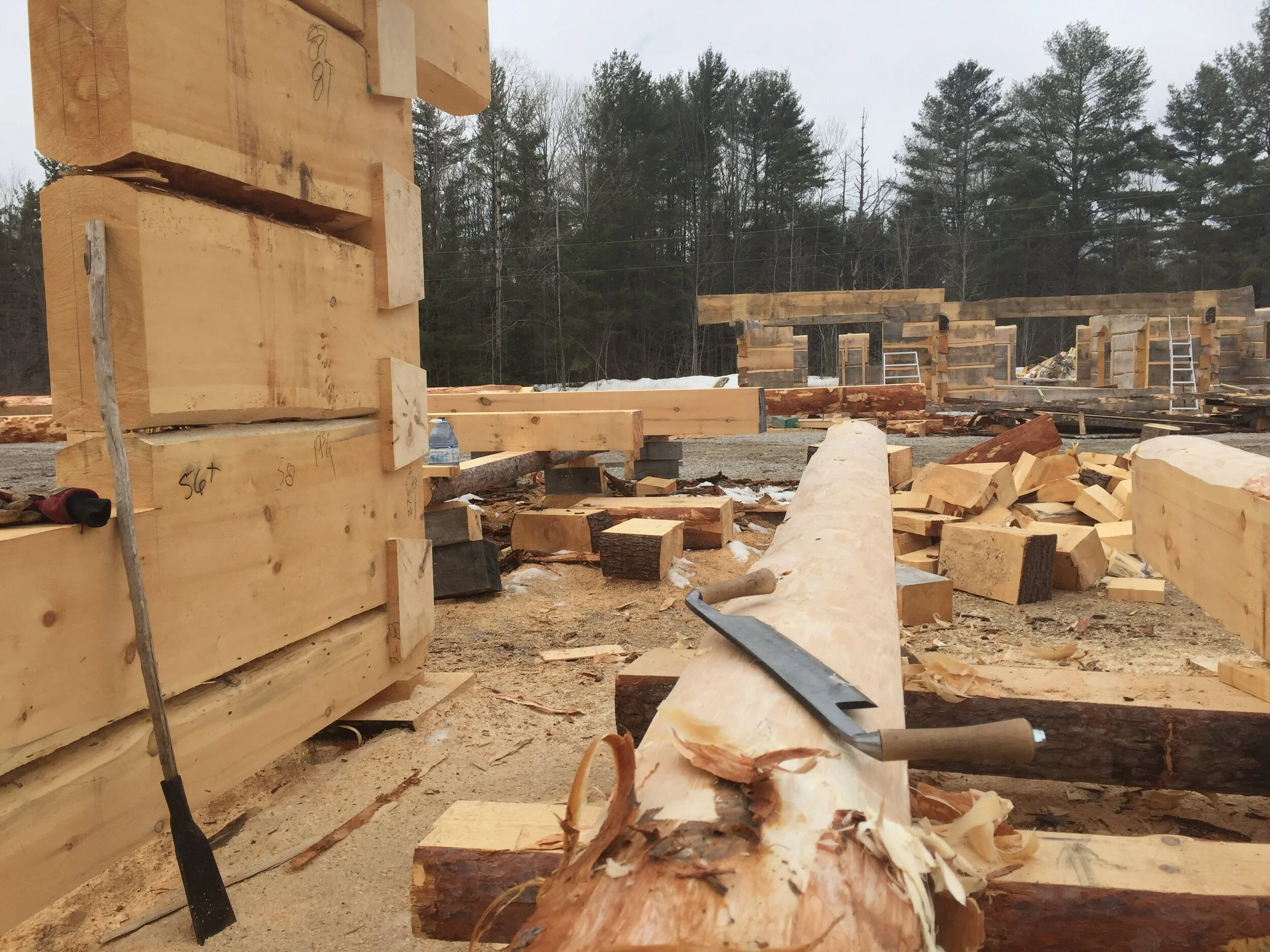 In school we built a few small timber frames and a hand-hewn dovetail log building. I really enjoyed taking a raw log and turning it into something. It was a big change working on the large scale homes with heavy machinery. I learned how to operate the telescopic handler for moving massive logs around the yard. I also learned how to operate the 40 foot bandsaw mill which we used to mill the logs to size, make timbers and occasionally lumber. The crew would use their chainsaws like a paintbrush, carving out notches and joints in the wood.